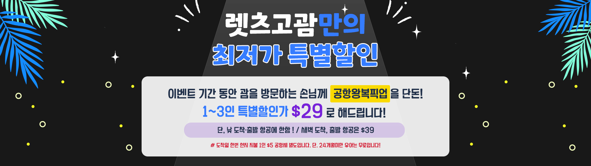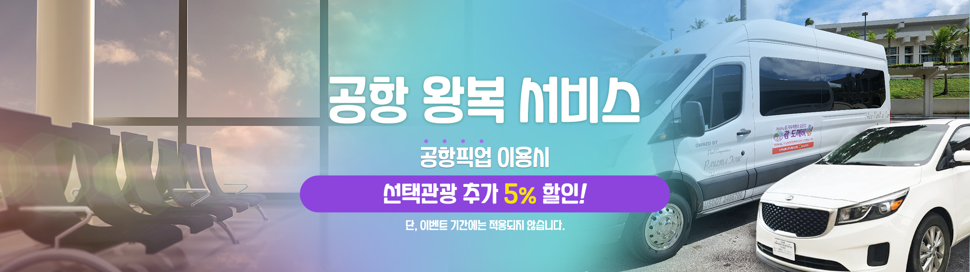 오늘 도착했습니다! 공항픽업만 우선 예약했어요, 첫 괌여행이라 어리버리 많이 탔는데 질문 했던거 그때그때 알려주시고,그냥 개인적으로 찾아가는 곳도 지름길이나 꿀팁 알려주셔서 너무 좋았어요! 할인이벤트도 하고 계시다고 하셔서 홈페이지랑 후기 좀 보고투어도 그냥 여기서 예약하려고요~